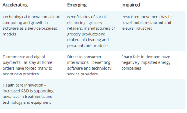 COVID-19 has accelerated and altered the growth dynamic for many companies and industries. Here is a summary of the potential impact on some secular themes: