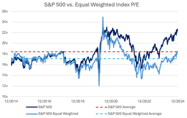 The strength of the US has started to throw up questions amongst investors as we head into 2025. The past few weeks have seen news feeds and social channels clogged with people pointing to the S&P 500 valuations and predicting doom and gloom for US investors. The chart below is used to support this negative view with the index P/E of 22.7x now almost at peak levels over 10 years and a 23% premium to the average, however, the Mag-7 now account for ~30.5% of the S&P 500 so focusing on the S&P 500 from a market cap weighted perspective has become less reflective of where overall US valuations stand.