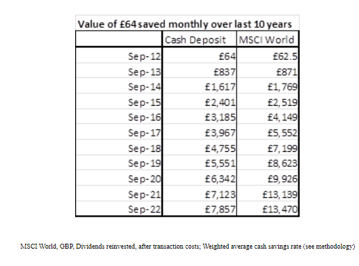 With an average £64 per month invested, this equates to a potential £5,790 worth of returns in stocks and shares, versus £177 of interest in cash savings over the last 10-year period.