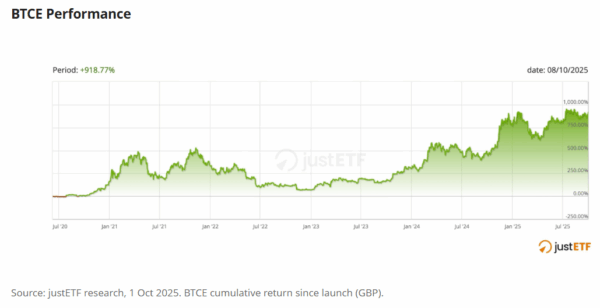 For example, BTCE is one of Europe’s largest bitcoin ETNs. The product has gained an incredible 921% since launch in 2020. That’s 54.8 % annualised.