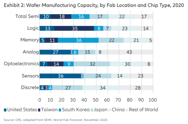 As the two charts below show, the US sits in the invidious position of having the world’s greatest demand for semiconductors, while currently possessing limited manufacturing capacity compared to its competitors and peers.