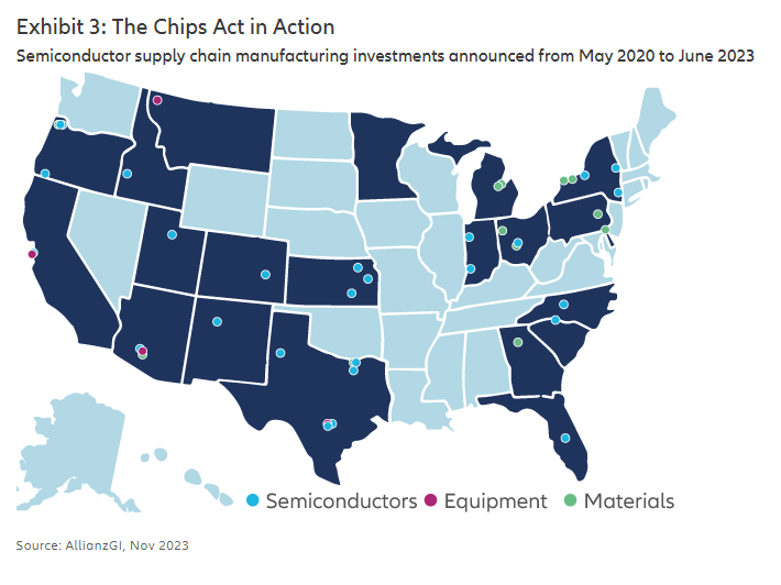 A watershed moment in the current realignment was the passing of the CHIPS and Science Act in 2022, designed to boost US development and manufacturing of semiconductors through subsidies, tax credits, and research funding. Indeed, the periods prior to and after the passing of this legislation saw the announcement of many significant investments in this sector across the US.