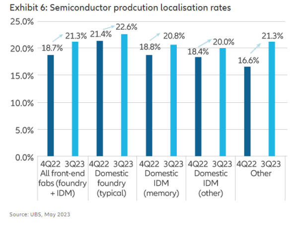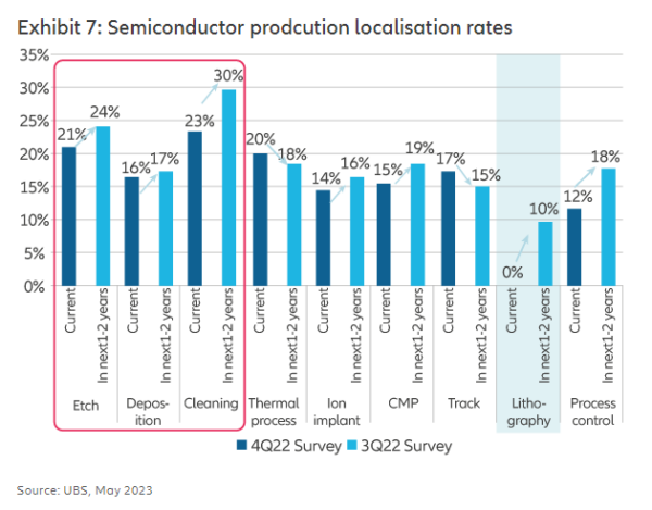 And it is also no secret that China is running on full steam to develop their own deep ultraviolet (DUV) equipment (it currently relies on imports from the Netherlands). More evidence of localization comes from a recent UBS survey of 75 respondents within the Chinese semiconductor industry. The results showed an increase in average localization rate in existing (and expanding) production lines.