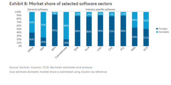Software is another area where China is spending much effort in localization. This is further aided by Xinchuang, the term referring to government localization, aiming to achieve self-control overall system security and promote technically competitive domestic IT companies. Localisation has been happening for some time and we now find that the market penetration of general software such as office applications, ERP1 , and less complicated industry specific software like MES2 and DCS3 , have achieved a relatively high localisation rate. And more efforts will be placed to close the technology gap for more complicated industry specific software.