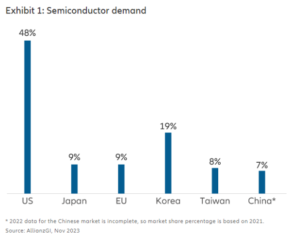 Despite this positioning and strong rhetoric, the US remains in a catch-22 situation; key US corporates derive over 20% of their revenues from China and the Chinese market remains an important growth driver for many US companies in this sector. Indeed, restricting sales into China will accelerate the replacement of US components in Chinese products, damaging some US players and aiding China’s own strategic interests. In addition, the US Federal Government’s perceived bias against “big tech – there are currently anti-competitive cases against several of the “Magnificent Seven” ongoing – is also seen as unhelpful by many.