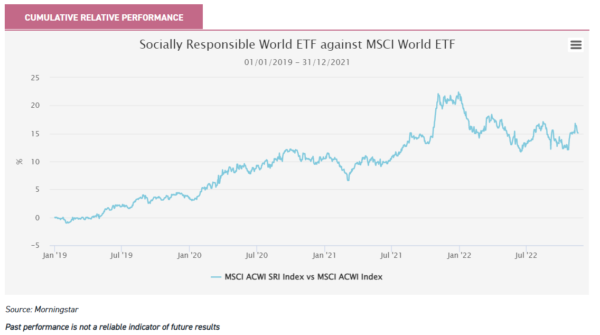 Such criteria favoured companies operating in technology and software-related sectors. The chart below shows the cumulative relative performance of the iShares MSCI World Socially Responsible Index (SRI) ETF against the iShares MSCI World ETF from 2019 to the end of 2021, with a rising line indicating outperformance of the SRI Index and vice versa.
