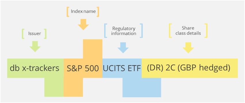 Towards the end of the ETF name you will usually abbreviations which provide information on the share class, such as: db x-trackers S&P 500 UCITS ETF 1C.