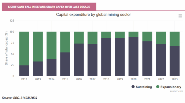 As illustrated in the following chart, expansionary capital expenditure has significantly fallen over the last decade as mining companies have prioritised debt repayment over new investment, resulting in strong balance sheets and lower leverage compared to historical averages and other sectors.