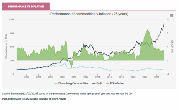 The following chart shows that the broad-based Bloomberg Commodity Index rose when US inflation exceeded 4% in 2008 and 2022. Gold has also often performed strongly in times of rising inflation, as seen in the period following the global financial crisis. Given the potential inflationary impact of US tariffs, this could provide a useful protection mechanism for investors.