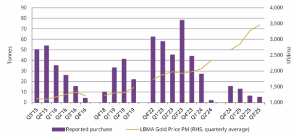Meanwhile, shares outstanding in gold ETFs, which should reflect demand from Western investors, have soared. According to Bloomberg there has been 63% growth in the Goldman Sachs Physical Gold ETF Shares Outstanding Index this year, meaning a 63% rise in the number of shares outstanding, reflecting massive net inflows. In fact, the World Gold Council reports September’s inflows into ETFs were the highest ever. I suggest therefore that 2025’s rally in gold has been driven by Western investors and their concerns, and central bank buying has been less significant than it was last year.