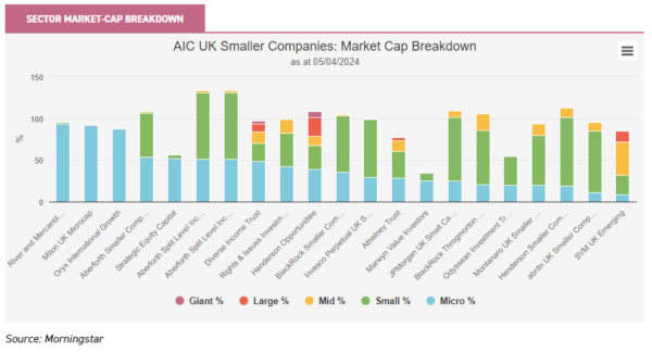 The AIC UK Smaller Companies sector is very populous, with 24 trusts at present, and whilst a number invest in micro caps, there are several specialists that operate exclusively in them, each offering contrasting approaches. We have listed the trusts below with their market-cap weightings. We note that weightings may not total 100% due to cash and gearing levels. Micro cap exposure is in blue.