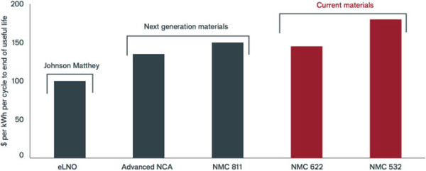 Source: Johnson Matthey annual results 2017/2018. Chart to scale, with eLNO indexed to 100. Note: Cost in US dollars per kilowatt hour (kWh) per cycle to end of useful life (80% retention of charge). Third-party testing by Qinetiq. Electrochemical data from Qinetiq benchmark testing, cost data from Johnson Matthey. NCA = nick/cobalt/aluminium. NMC = nickel/manganese/cobalt.