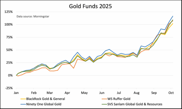 The top four funds are the same as last month, but in a slightly different order. The SVS Sanlam Global Gold & Resources fund, which was in third place in August, has now climbed to the top with a one-month return of more than 28%.