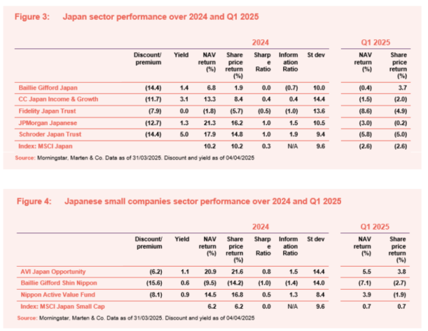 We think it is still far too early to make meaningful conclusions as to which of the strategies will be the least-worse-off in the end, although it does appear that some of the previous performance rankings have been upended, with Ballie Gifford Japan falling the least. But just like 2024, the NAV performance rankings of the large cap peer group over the first quarter don’t seem to be related to investment style. We think that 2025 could be another year of active management and stock selection driving returns.