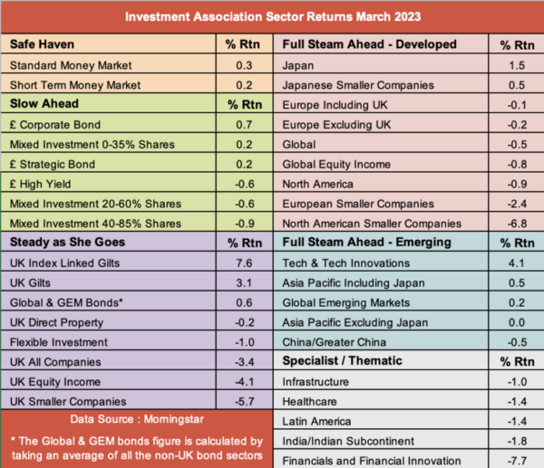 There are probably other contributory forces in play, but the recent banking crisis has probably been one of the most significant factors in the increasing value of the gold and gilt funds in the last month. Although they are seen as safe, because you are very unlikely to lose everything, that does not mean that in the short term the prices cannot fluctuate wildly. Although UK Index Linked bonds were the best-performing sector last month, it is worth remembering that in 2022 they went down by 35%.