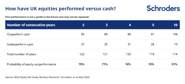 For me, the standout stat of the 2023 report is the 91% probability of UK equities outperforming cash over any 10-year period in the past 123 years. Meanwhile, over two, three, four and five years, the equivalent probability was 70% or above (and more than 60% versus gilts for all of the aforementioned consecutive, or “rolling” timeframes).
