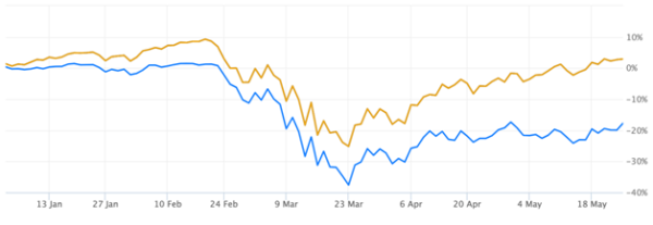 The graph below tracks the performance of these two ETFs in 2020, with growth in yellow and value in blue.