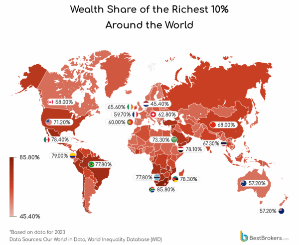 Recent analysis suggests that the world’s top 1% of earners now possess more wealth than the vast majority of the global population combined. To explore how the distribution of wealth held by the richest 10% and richest 1% has shifted in the 21st century, the team at BestBrokers gathered data from the open source World Inequality Database. Covering a span of 24 years and 217 countries, the dataset measures the portion of national wealth, encompassing both financial and non-financial assets, controlled by the wealthiest people in society.