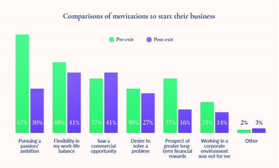 Over two–fifths (41%) of entrepreneurs start their own business seeking a flexible work-life balance, while over 40% of those who have exited cite health and family priorities as key motivations for exiting.