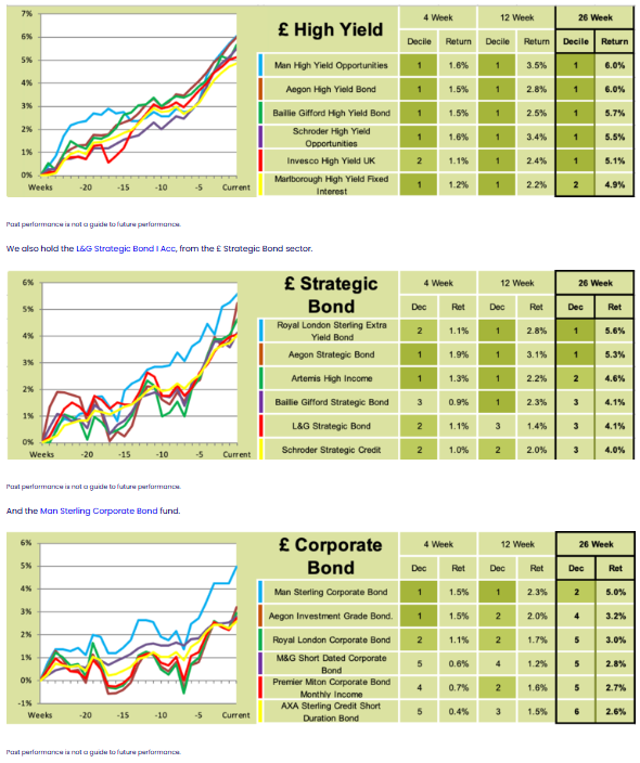 We invested in the Invesco High Yield and Schroder High Yield Opportunities funds in September 2023 and now also hold the Baillie Gifford High Yield Bond B Acc and Man High Yield Opportunities funds. Last week, all four were still showing in our table highlighting the best-performing funds in the Sterling High Yield sector over the past 26 weeks.