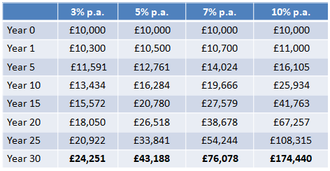 I will start with £10,000 – an arbitrary figure but an amount that people can relate to. I understand these numbers are commutative – so if you have £100,000 as your starting point, then you just add a ‘0’ onto the numbers (i.e. multiply by 10). If your starting point is £40,000, then just multiply by 4; if your Starting Point is £5,000, then halve the numbers – you get the point.