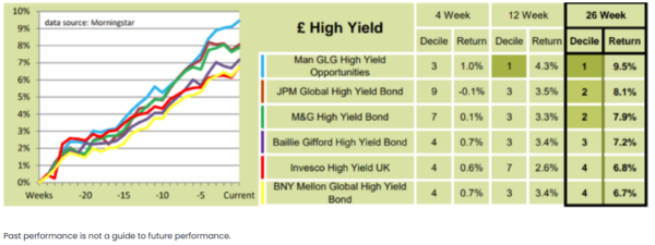 Our Ocean Liner portfolio holds the top fund in the £ Corporate Bond sector, the Man GLG Sterling Corporate Bond fund. Last week, it was showing a 26-week gain of 9.6%, which also compared favourably with the leading funds in the £ High Yield and Mixed Investment 40-85% Shares sectors.