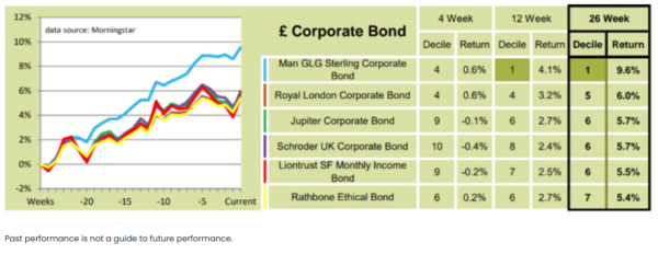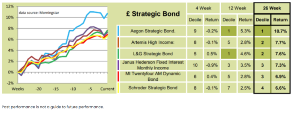 The Aegon Strategic Bond fund, from the £ Sterling Bond sector, had done even better, up 10.7% in 26 weeks, but it was slightly down over the past four weeks.