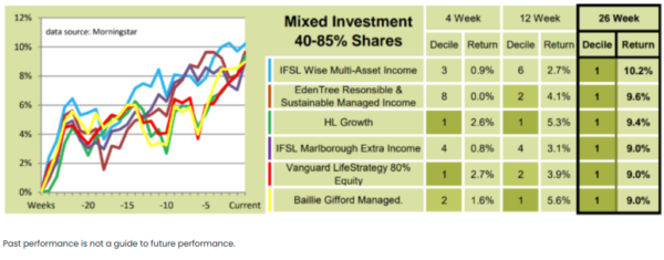 When we looked at our analysis last week, the Mixed Investment 40-85% Shares sector was back at the top of the “Slow Ahead” Group, based on its performance over four, 12 and 26 weeks.