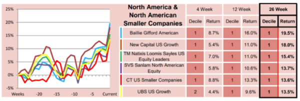 However, when we looked last week, our combined North America & North American Smaller Companies sector was once again the clear leader over the past four weeks. It had risen by 5.2% in four weeks, 8.2% in 12 weeks, and 9.4% in 26 weeks. Some of the best-performing funds had done much better.