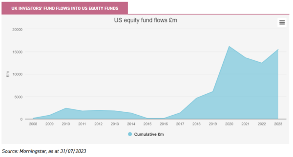 This data includes ETFs, as well as traditional open-ended funds, so we aren’t ignoring passive strategies. The slightly depressing message this chart sends is that UK investors, as a whole, only recently became excited about US equities at the point they were starting to peak out. It’s likely, therefore, than many investors new to the US will be nursing losses.